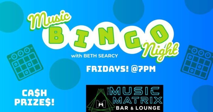 MUSIC BINGO: Fri 8pm-10:30pm The Music Matrix. Your chance to play some rounds of Bingo featuring some of your favorite music and win cash and prizes too! Hosted by Beth Searcy. Hear some of your favorite music and win cash and prizes. DJ Heavy T takes over after Bingo and you can dance till 2 AM!