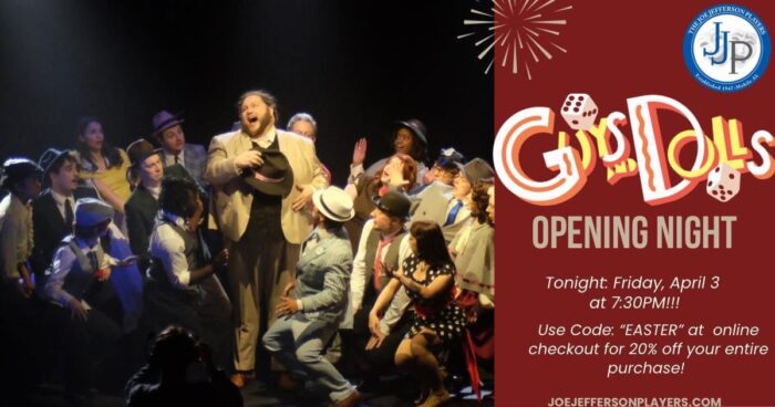 GUYS & DOLLS- Fri/Sat 7:30pm; Sun 2pm; (Apr 3- Apr 19); Joe Jefferson Playhouse, Mobile. Guys and Dolls is a musical about gamblers and the women they love, set in Depression-era Times Square, featuring the overlapping stories of Sky Masterson, a high-roller who falls for Sarah Brown, a mission worker, and Nathan Detroit, a gambler who is engaged to Miss Adelaide, a nightclub singer. INFO HERE