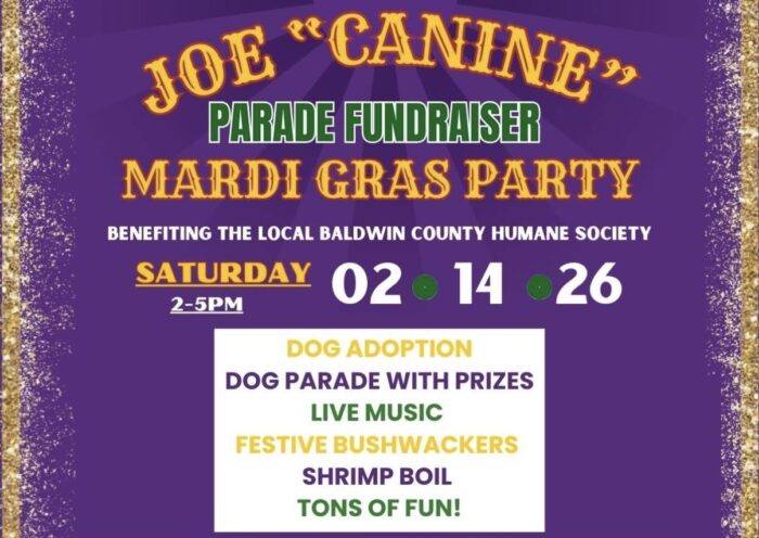 JOE “CANINE” PARADE & FUNDRAISER- Sat 2-5pm. Waterfront Restaurant, Daphne. Dog parade with live music, a shrimp boil, with proceeds benefitting the Baldwin County Humane Society.