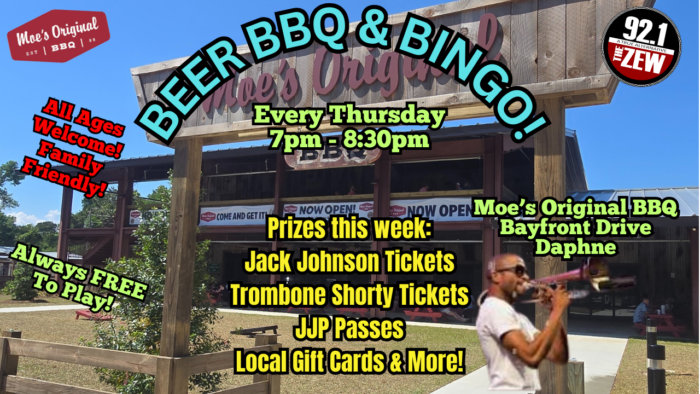 BEER BBQ BINGO- Thurs 7-8:30pm. Moe’s BBQ Daphne. Join our own Clint and Cornbread as they serve up some fun free bingo, with prizes fun, and that great Moe’s BBQ and drinks.
