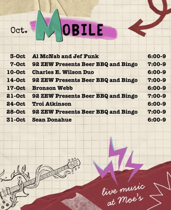 MOE’S BBQ- Fri Charles E. Wilson Duo 6-9pm-Mobile/ Blind Dog Mike Duo- Daphne 6-9pm.