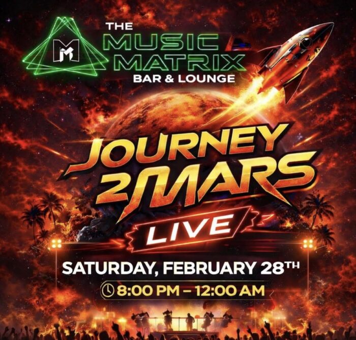 JOURNEY 2 MARS – Sat. 8pm- 12am. Music Matrix Bar and Lounge. High energy and great vibes is going to be the move Saturday night at the Music Matrix. Come alone, or bring friends to experience out-of-this-world moments you don’t want to miss.