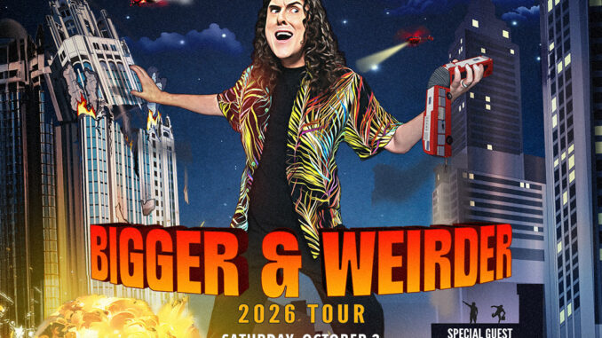 The new tour artwork shows Weird Al towering over a city in full comic book style, complete with futuristic gadgets, exploding buildings, terrified crowds, and that signature larger than life grin. It perfectly captures the wild and unpredictable spirit fans love about him.